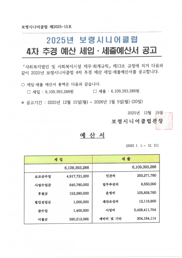 「사회복지법인 및 사회복지시설 재무·회계규칙」13조에 따라 2025년 보령시니어클럽의 4차 추경예산서를 붙임과 같이 공고합니다.