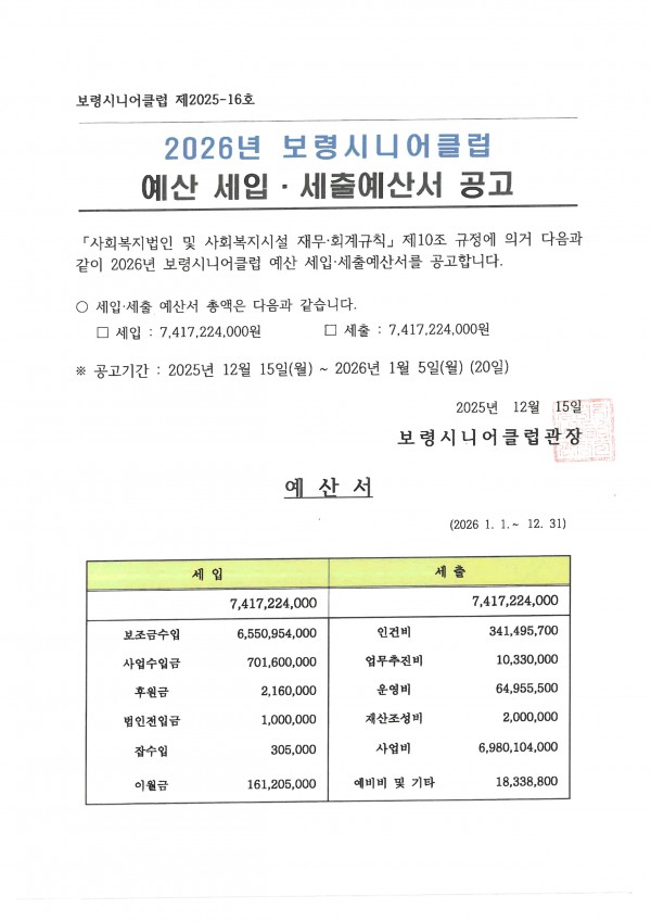 「사회복지법인 및 사회복지시설 재무·회계규칙」10조에 따라 2026년 보령시니어클럽의 예산서를 붙임과 같이 공고합니다.